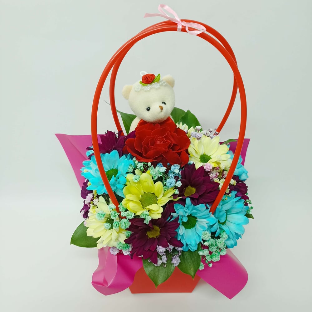 Коробка с цветами «Цветы в сумочке с игрушкой 5» из хризантем и гипсофил