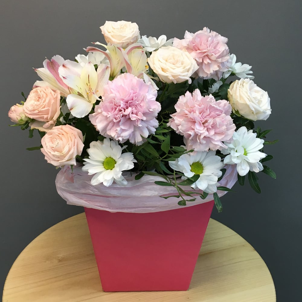 Коробка с цветами «Цветы в трапеции» из роз и хризантем