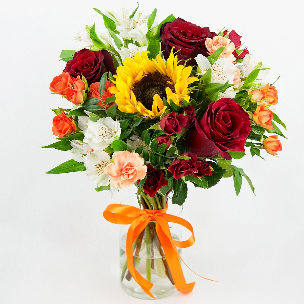 A passionate and fiery bouquet in scarlet tones of bush and single-headed roses, sunflower, chrysanthemum and alstroemeria for your dearest recipient.