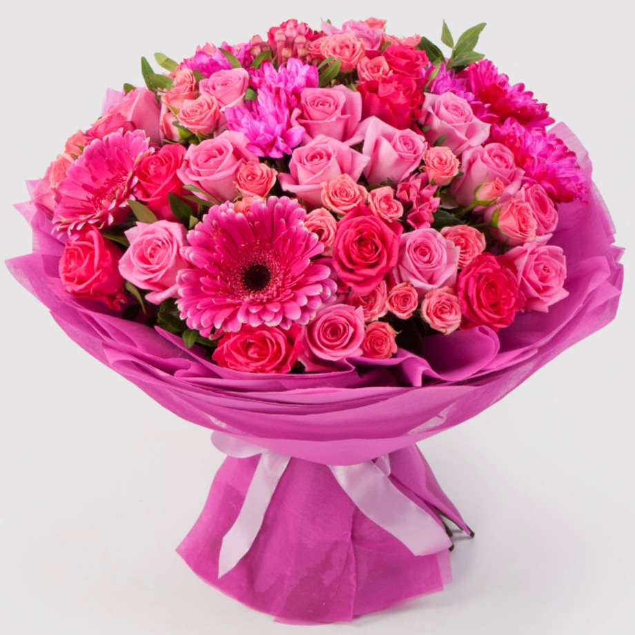 Розовый пышный букет из роз, гербер и хризантем в яркой бумажной упаковке подарит ощущения счастья, легкости и наивной романтики, которой иногда не хватает в серых буднях большого города.