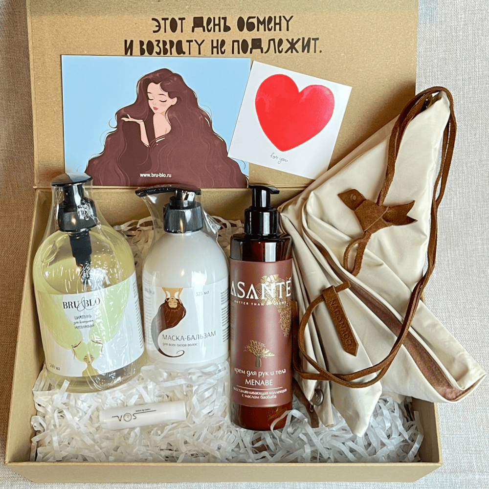 Это тот самый подарок, после которого она улыбается чуть дольше обычного. Потому что здесь — не случайные вещи, а продуманный уход для красоты и настроения. Уход для волос, который делает их мягкими, блестящими и живыми. Тёплый древесный аромат на коже — спокойный, притягательный, запоминающийся. И красивые оригинальные аксессуары, которые хочется носить каждый день — как напоминание о тебе. Идеальный подарок любимой, если хочется не просто подарить, а удивить, восхитить и остаться в её памяти. Состав: 1. Шампунь для блондинок от премиального российского бренда Bru&Blo (325 мл) создан для красивых роскошных волос. 2. Маска-бальзам для волос от Bru&Blo (325мл). 3. Восстанавливающий крем для рук и тела Menabe (250мл с дозатором) от российского бренда Asante. 4. Бальзам для губ Shea от VOS (5мл) основе кокосового воска, 5. Украшение «Птица» на шнурке, из замши от российского бренда Nadonado. 6. Косынка Unu clothing уютная и невероятно женственная. Предлагаем выбрать цвет косынки: серый серебристый, розовый, молочный, коричневый, черный (укажите в примечании к заказу) 7. Две дизайнерские открытки 8. Крафтовая коробка из плотного картона на магнитном клапане с вдохновляющей надписью