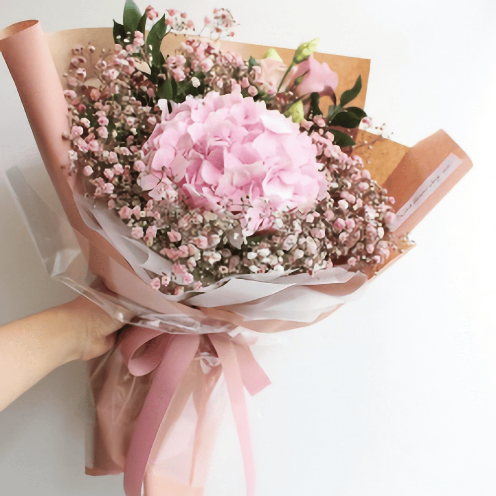 Воздушная гипсофила окутывает изящную гортензию - прекрасная композиция букете.