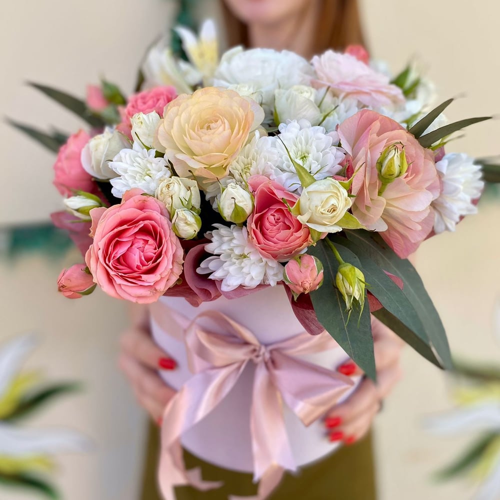 Шляпная коробка с цветами «Ты прекрасна» из роз и хризантем