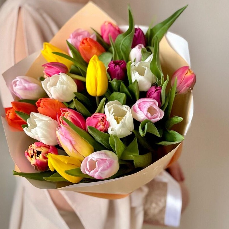 Свежие разноцветные тюльпаны микс в стильной упаковке! Тюльпаны - лучший способ вдохнуть весну в пространство и порадовать близкого человека.