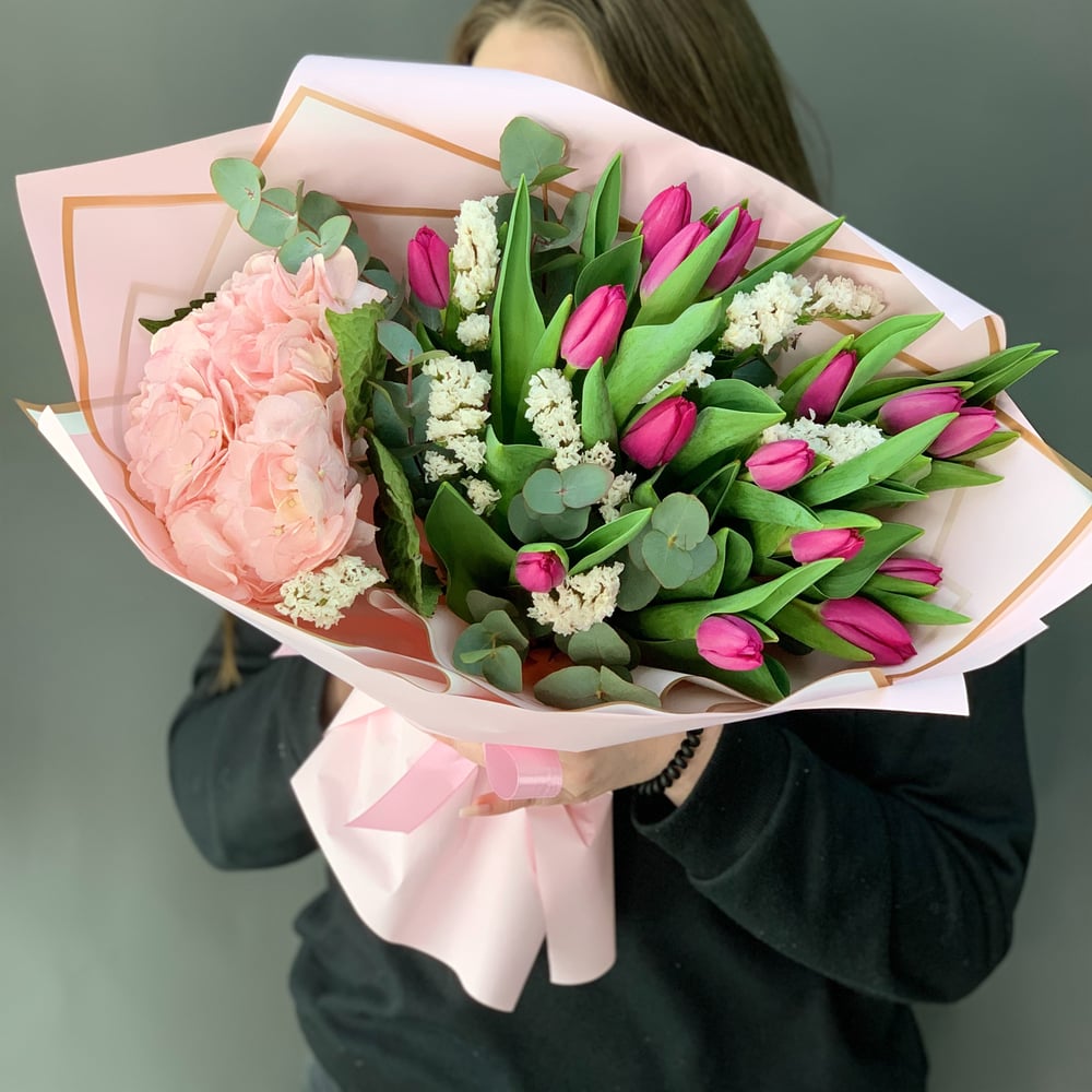 Тюльпаны с гортензией - это уникальное сочетание цветов, которое станет отличным подарком для любого случая. Гортензия придает букету неповторимый шарм и глубину, делая его более изысканным и ...