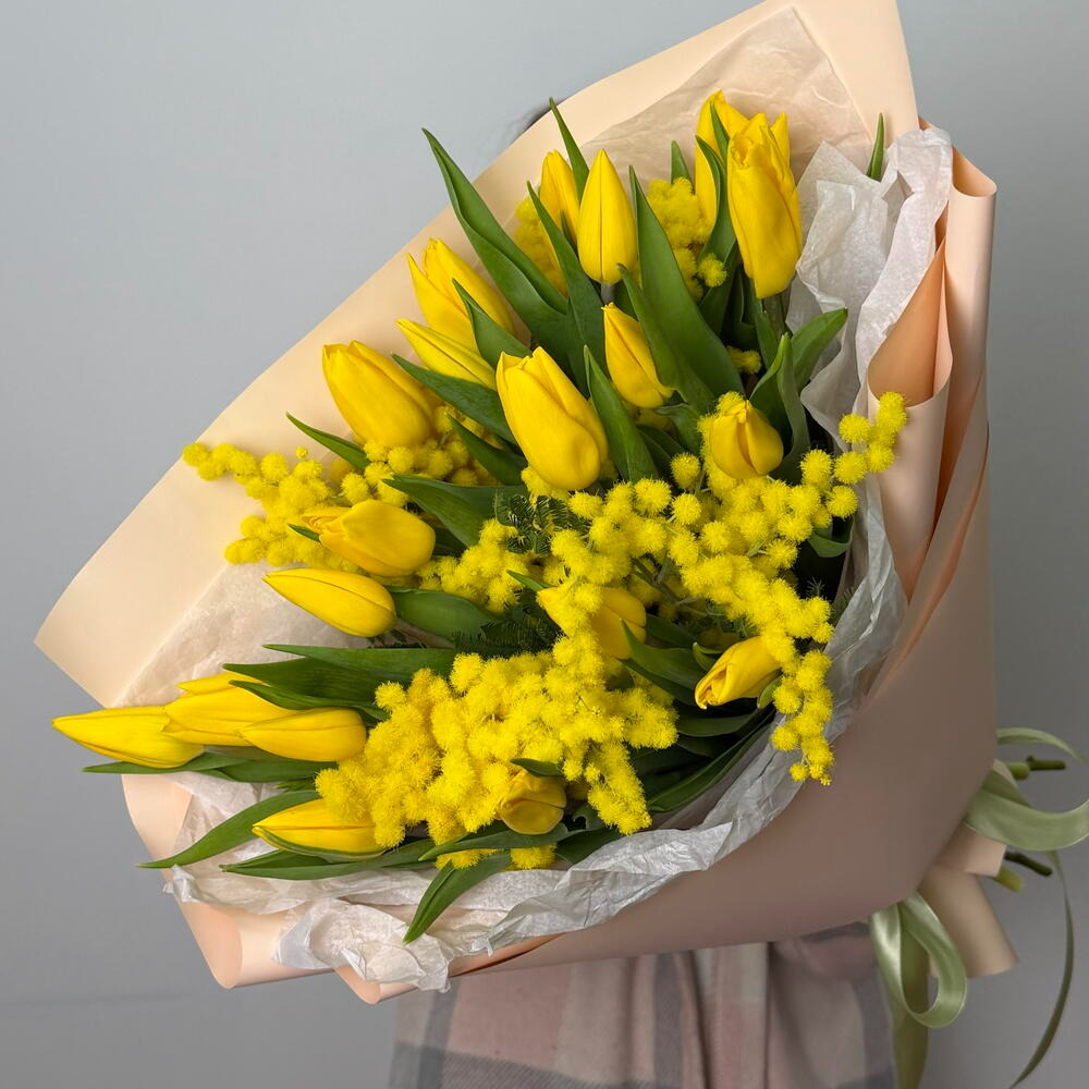 19 жёлтых тюльпанов + мимоза = формула идеального дня! Тюльпаны — это энергия и радость, мимоза — нежность и лёгкость. Вместе они создают букет‑антистресс: просто посмотрите — и улыбка появится сама собой!