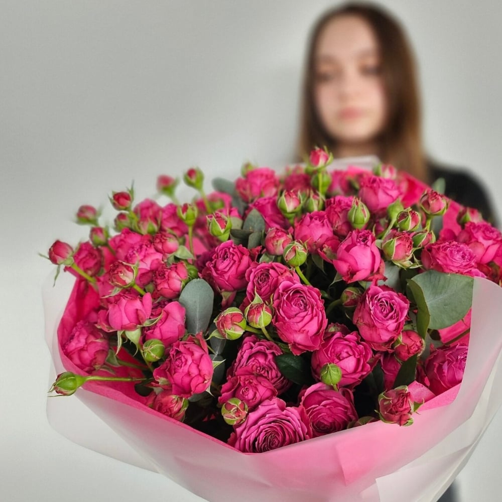 Букет выполнен из ярко розовых кустовых пионовидных роз и эвкалипта. В составе букета 11 веток. Размер букета 40×50