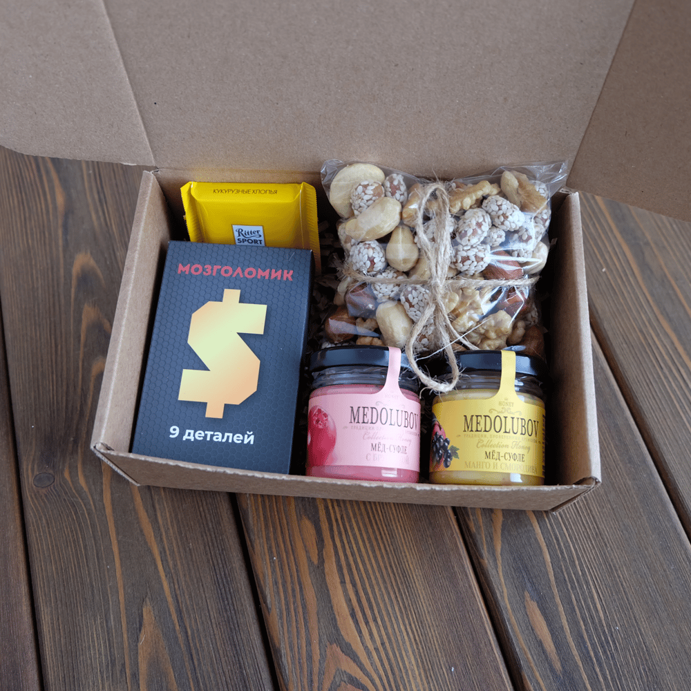 В наборе: 📌Коробка 16*11*6 см 📌Головоломка 📌Крем-мед 2 шт (по 40 гр, вкусы разные) 📌Ореховый микс 📌Шоколад Ritter Sport mini