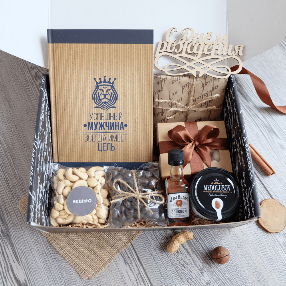 В наборе: 📌Коробка 27*21*9 см 📌Ежедневник недатированный А5 формата 📌Виски Jim Beam 50 мл 📌Миндаль в шоколаде 📌Арахис в шоколаде 📌Кешью 📌Мёд-суфле 120 гр (вкусы разные) 📌Шоколад Ritter Sport