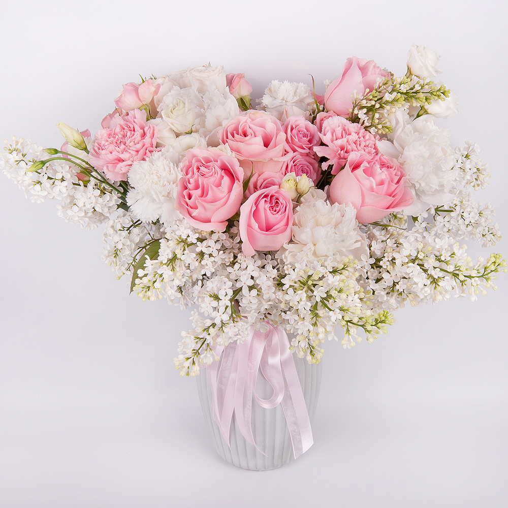 Погрузитесь в мир утонченной красоты с этим элегантным букетом, в котором розовые розы, гвоздики и пионы сливаются в гармоничное сочетание. Пионовидная кустовая роза и сирень завершают композицию, а лента придает ей очарование.
