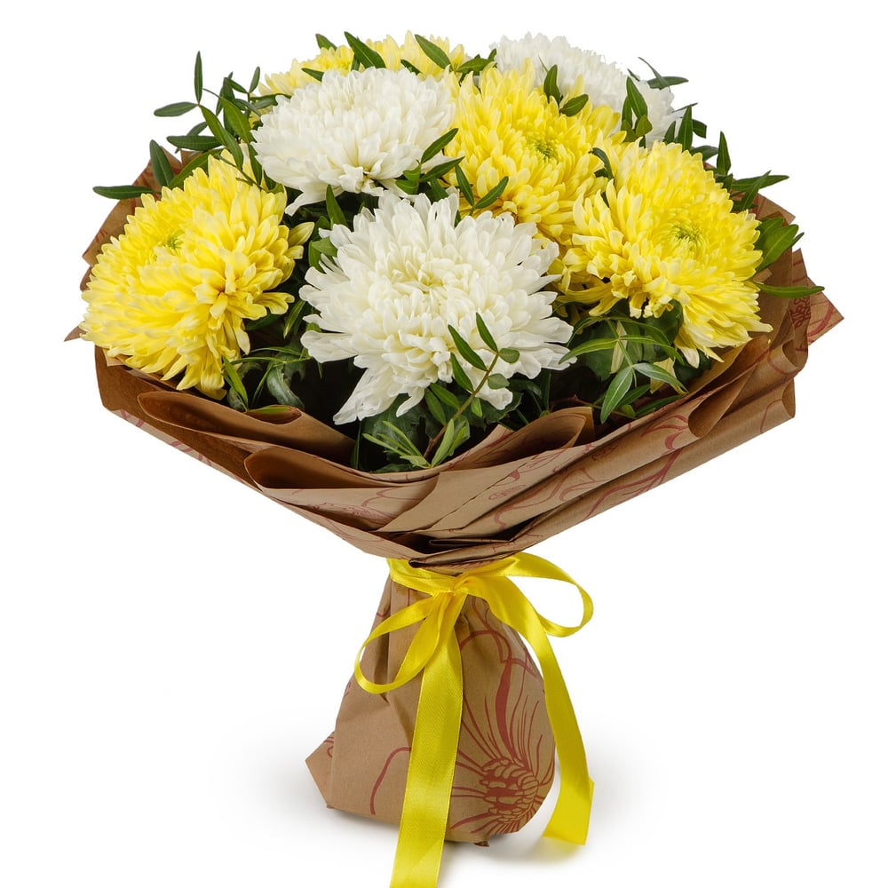 Роскошный букет из 7 хризантем белого и желтого цвета с необычайно пышными бутонами завораживает, очаровывает и притягивает к себе восхищенные взгляды. Это настоящая цветочная классика, получить ко...