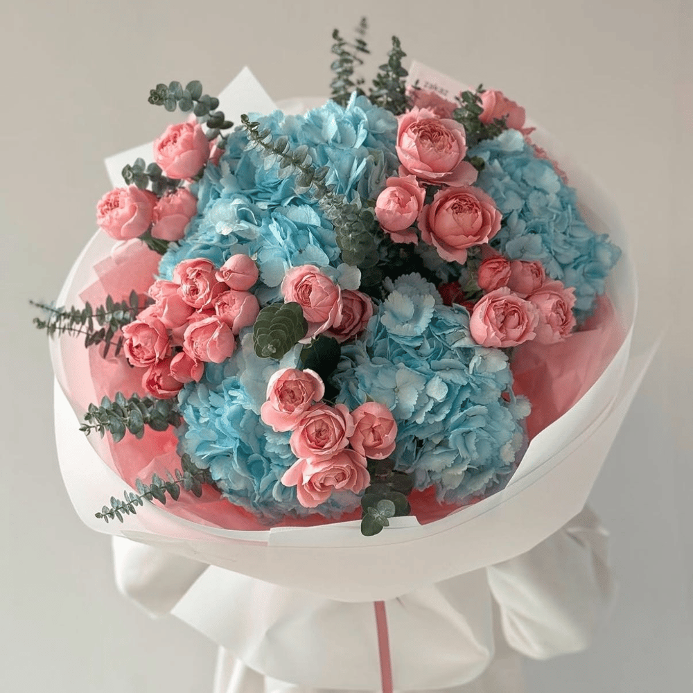 Букет «Утро на море» из роз и гортензий