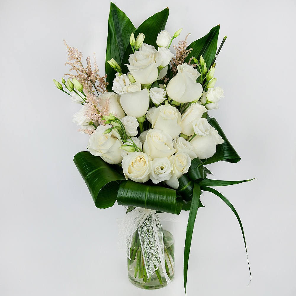 Элегантный и трогательный букет из белоснежных роз и лизиантусов создан для того, чтобы выразить теплые воспоминания и глубокие соболезнования близким умерших.