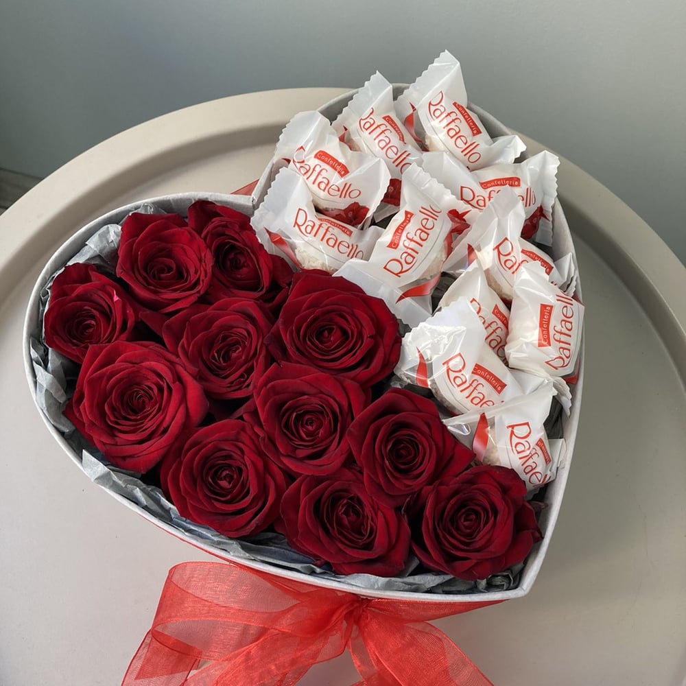 Яркая композиция в виде сердца состоит из 11 красных роз и конфет Raffaello с миндальным орехом 150г. в декоративном оформлении. Высота композиции 10 см.