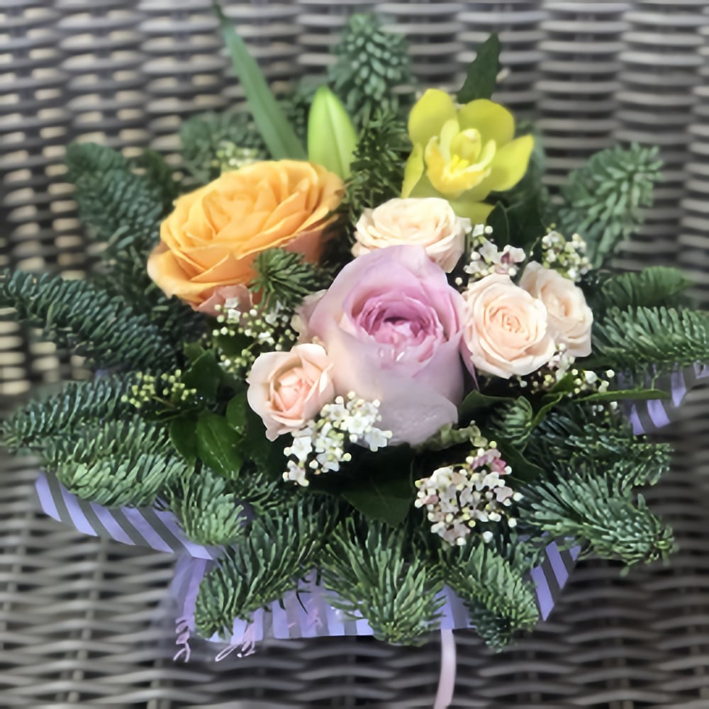 Зелень декоративная ( из наличия ) роща одноголовая, роза кустовая, орхидея, пиофлор, упаковка, лента.