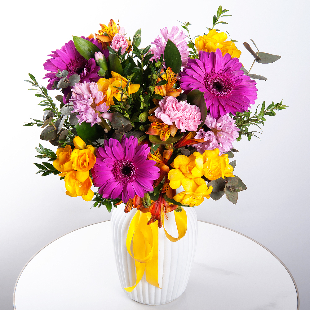Этот букет - как танец цветов, где каждая нота - это цветок. Герберы, гиацинты, альстромерии и гвоздики сплелись в танце с фрезиями и фисташкой. Эвкалипт прекрасно дополняет композицию, а современная упаковка красиво обрамляет букет.