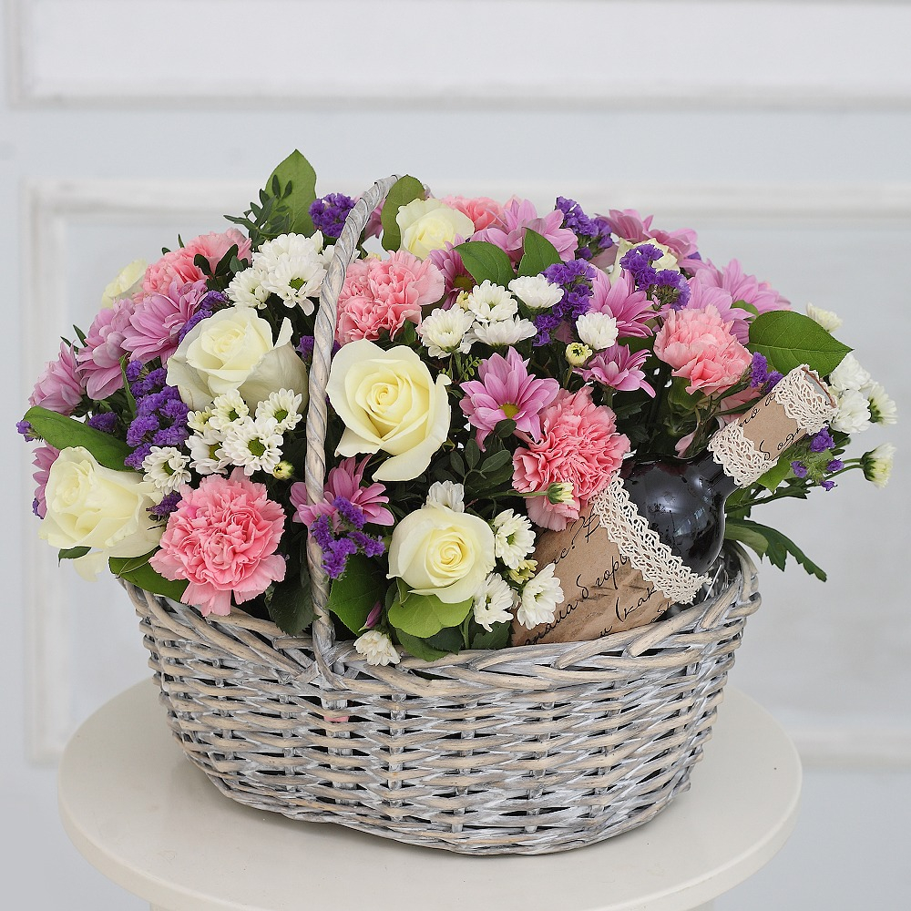 The composition will present you a wonderful mood. Rich roses, cloves and golden daisies are composed in a twigged basket. A bottle of good wine will add to the holiday mood. A wonderful present for…