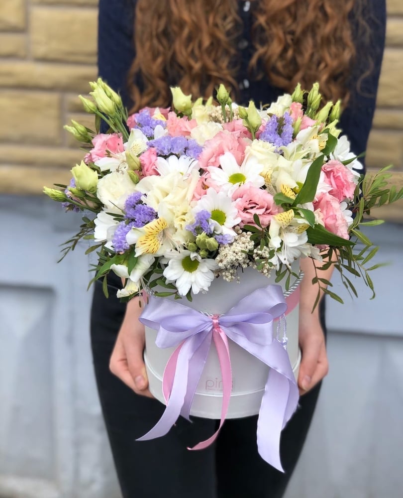 Шляпная коробка с цветами «Ванильное небо» из роз и эустом
