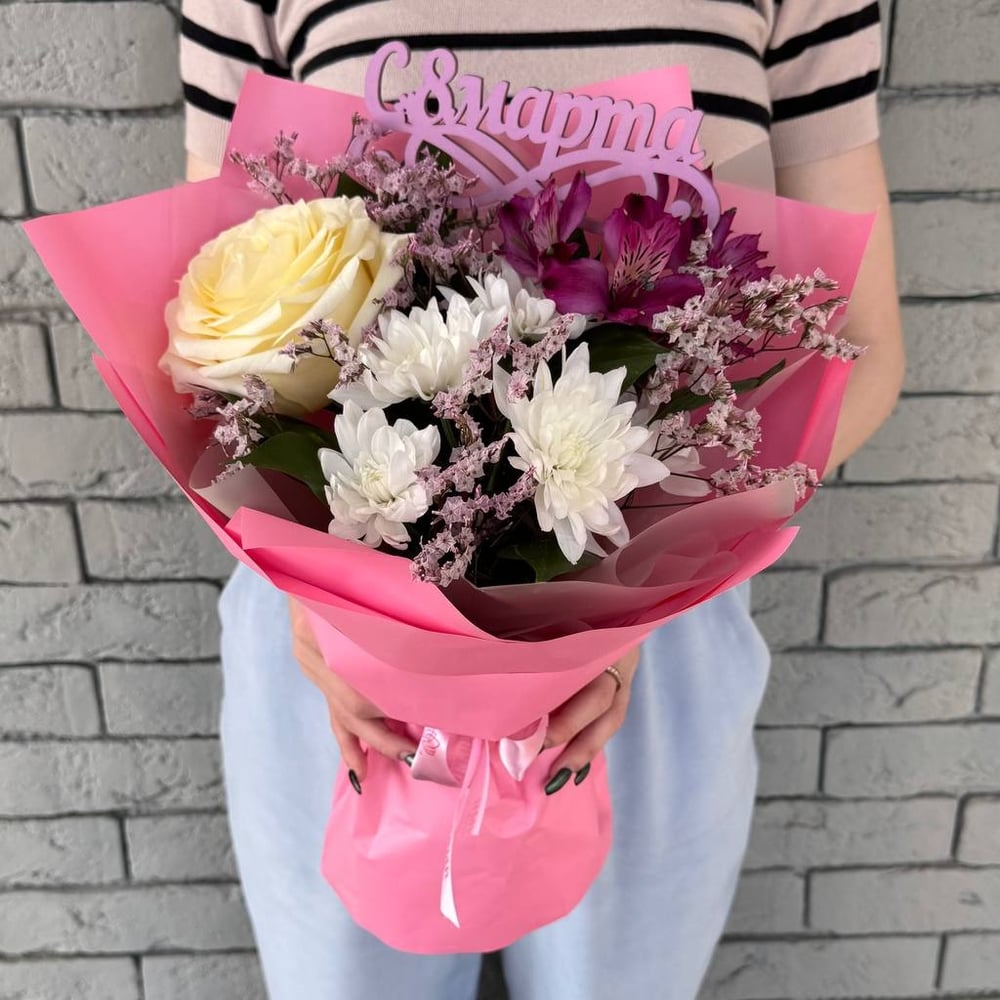 Погрузитесь в мир красоты с нашим потрясающим букетом! Эквадорская роза, хризантема и альстромерия создают идеальное сочетание. Каждая деталь этого букета наполнена гармонией и свежестью.