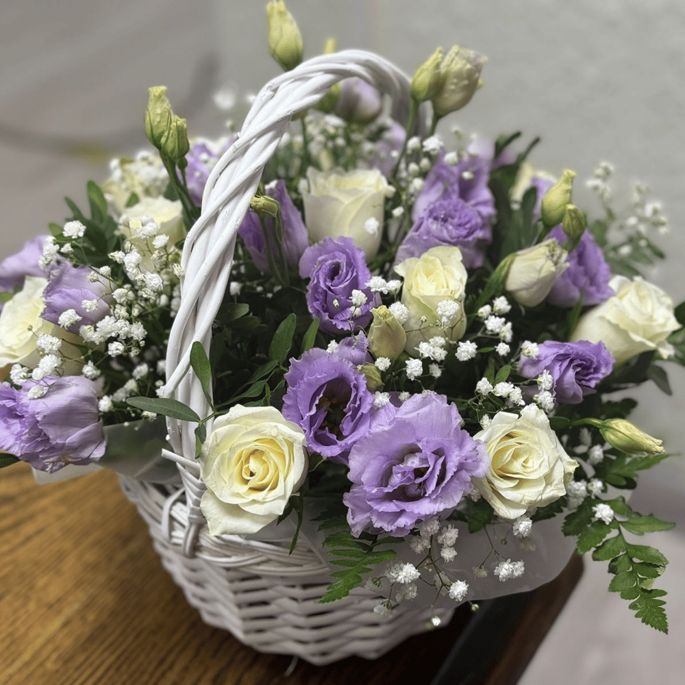 Корзина с цветами «Вдыхая осень» из роз и эустом