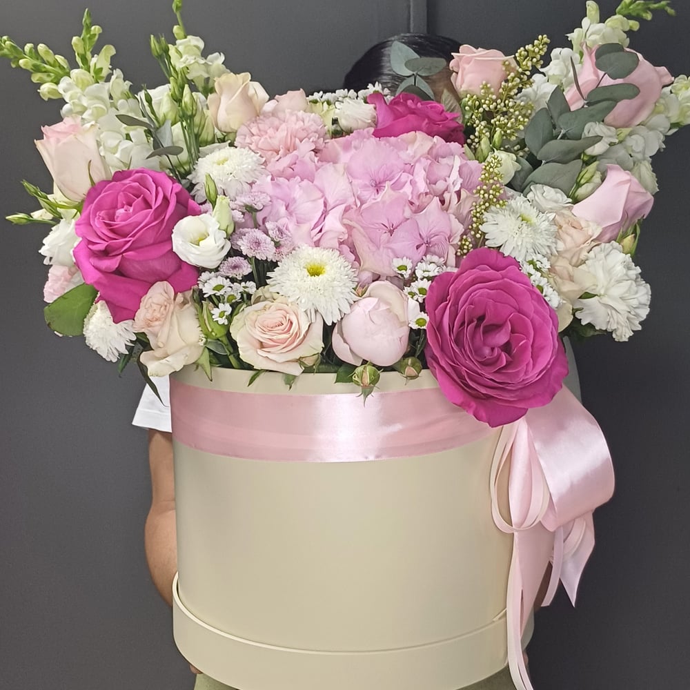 Композиция в шляпной коробке с розовой гортензией, розами и герберами — это яркое и элегантное сочетание цветов, создающее атмосферу радости и утонченной красоты. Розовая гортензия, с её пышными, м...
