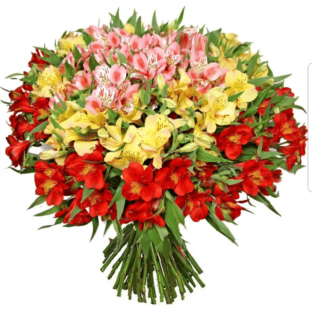 Букет из 35 альстрамерии в трех цветах. Перевязан лентой. «При отсутствии некоторых видов и расцветки цветов, компания оставляет за собой право осуществить равноценную замену по согласованию с заказчиком»