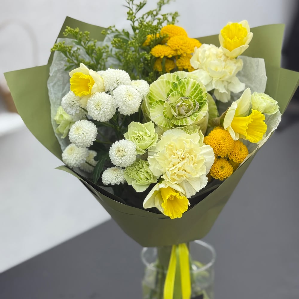 Сборный, яркий букет из нарциссов, диантусов, брасики и декоративной зелени