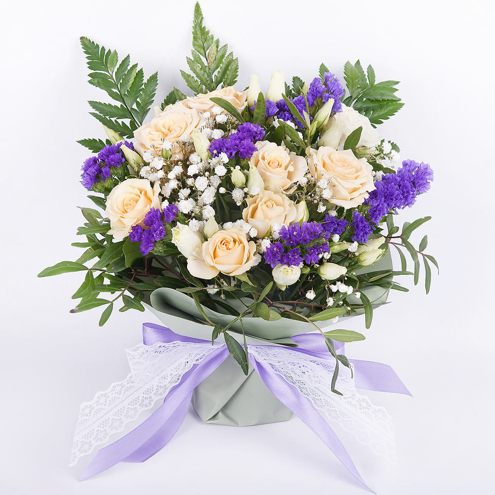 Композиция «Весенний натюрморт» из роз и гипсофил