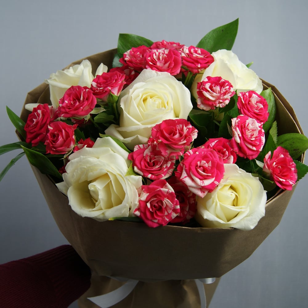 Чтобы сказать даме о своих чувствах, на протяжении многих веков мужчины дарили розы. Букет с кустовыми розовыми и белыми розами намекает на союз нежности и лаконичности. Этот букет идеальный способ, выразить романтику, страсть и любовь.