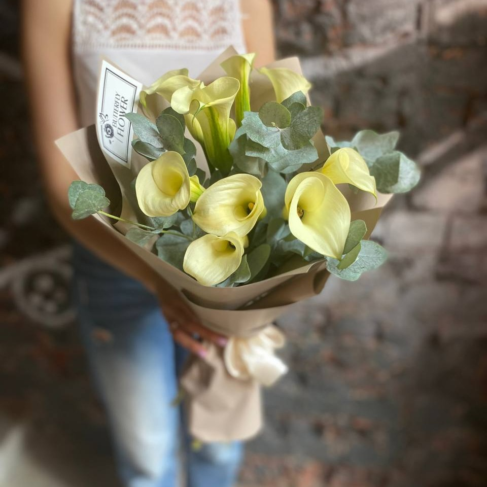 Букет из 9 белых калл с эвкалиптом в упаковке