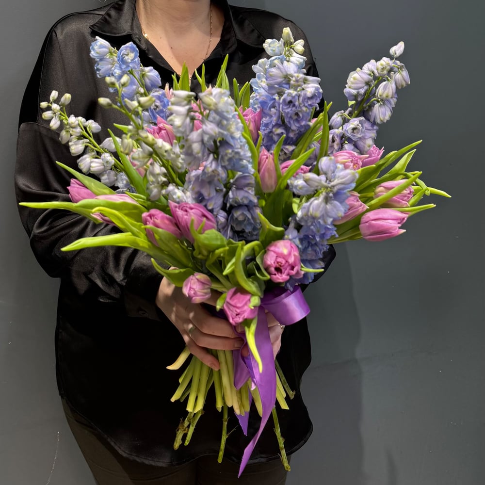 Букет «Весенний вайб» из тюльпанов и экзотических цветов