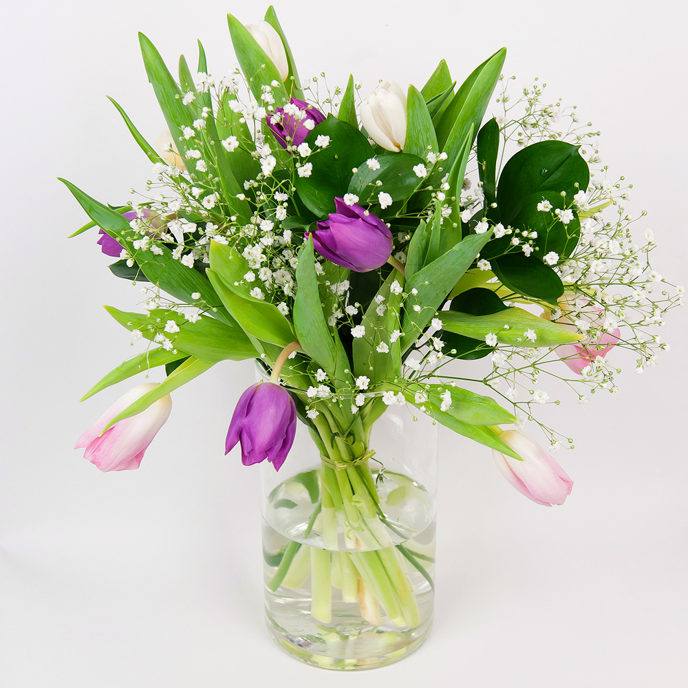 Что касается весны, это всегда нежные весенние цветы! Букет из розовых и сиреневых тюльпанов в трогательной обрамлении облаков гипсофилы подарит любимой радость и весеннее настроение.