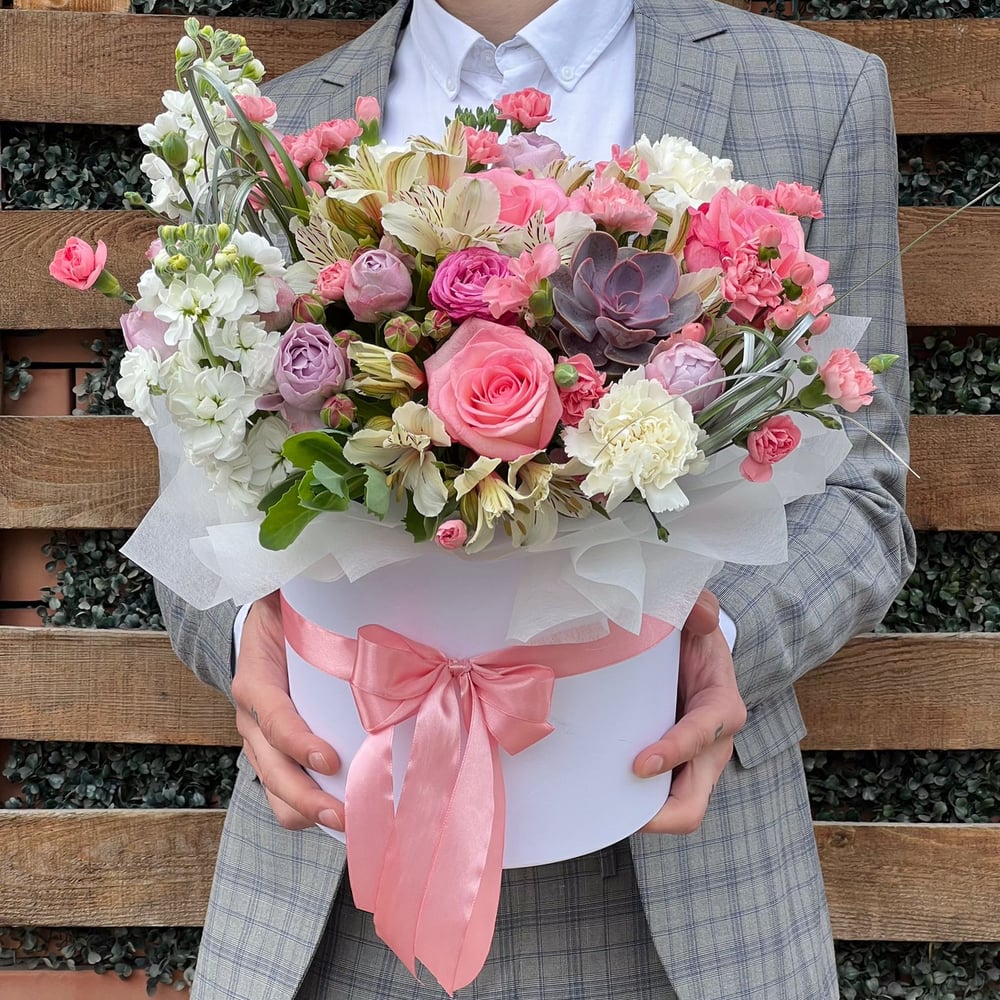 Шляпная коробка с цветами «Весенняя мелодия» из гвоздик и роз