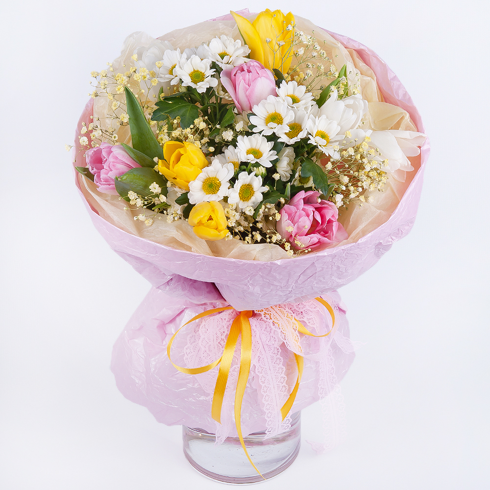Букет «Весенняя песня» из тюльпанов и хризантем