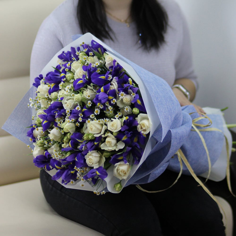 Букет «Весенняя полянка» из ирисов и ромашек