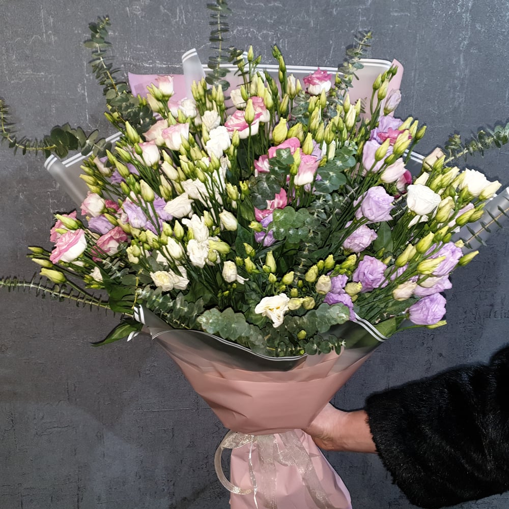 Настоящий салют любви и радости из великолепных лизиантусов! Нежные бутоны молочного, кремового, сиреневого и пудрово-розового оттенков в обрамлении из прохладных листьев эвкалипта созданы, чтобы р...