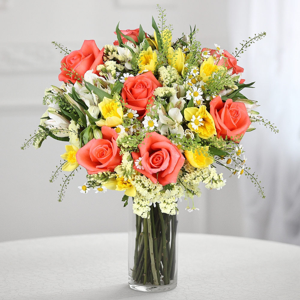 Букет «Весна»: танацетум, розы, нарциссы, лилии, статица. Ищете идеальный букет, который подарит весеннее настроение? Тогда вам понравится наша композиция из танацетума, роз, нарциссов, лилий и ст...