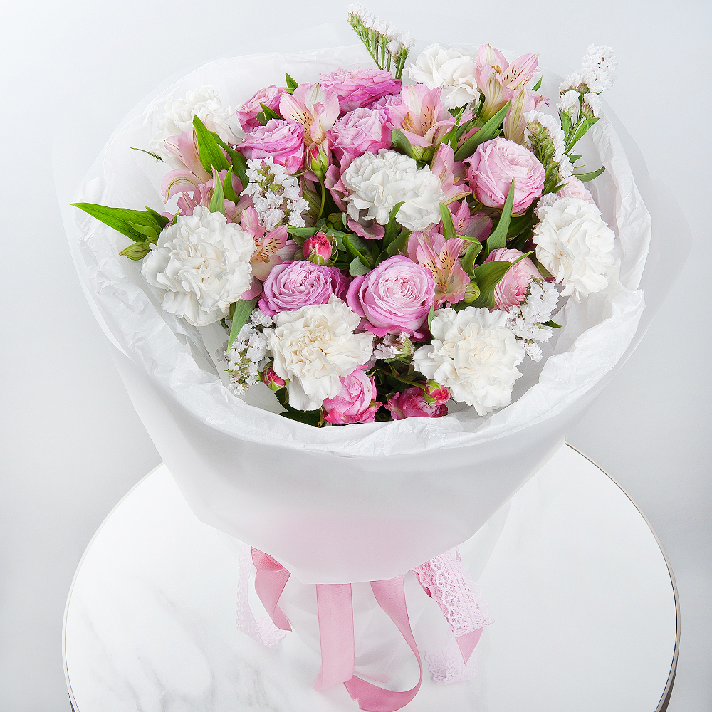 Этот букет, как вихрь эмоций, объединяет пионовидные кустовые розы, гвоздики, альстромерии и статицу. Современная упаковка подчеркивает переменчивость и яркость композиции. Букет станет идеальным подарком для выражения самых сильных чувств и эмоций.