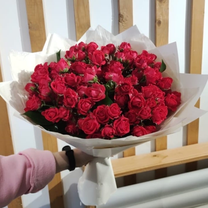 Яркий букет из кустовой розы , круглой формы