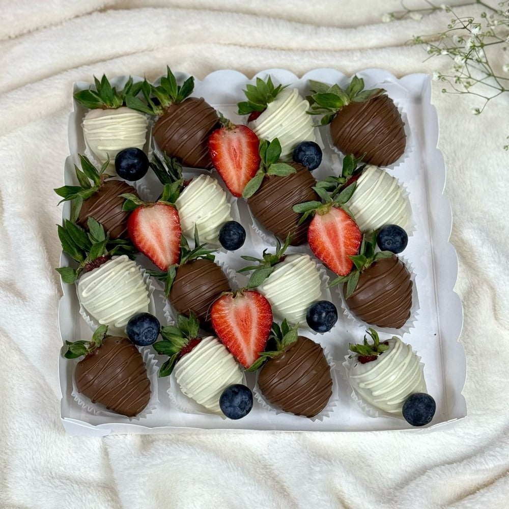 сочетание клубники в шоколаде, свежей клубники и голубики в одной коробке