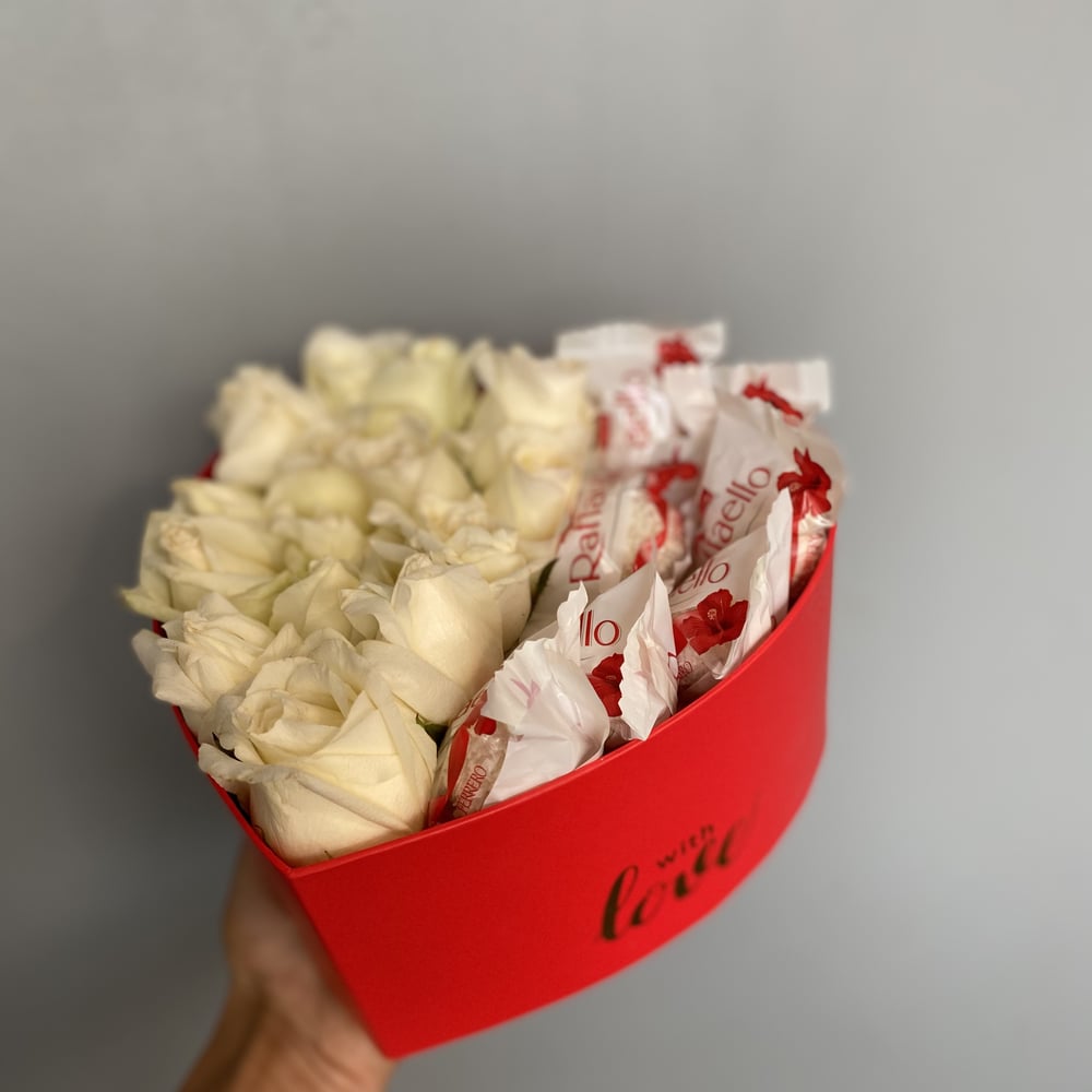 Композиция из белых роз сорта Аваланч и Рафаэлло порадует любую девушку! Особенно сладкоежек)!🍬