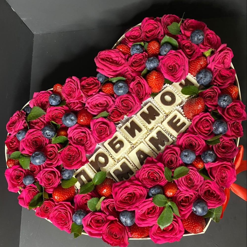 Коробка сердце с цветами , клубникой и голубикой . Цвет букв и цветов может меняться по вашему вкусу