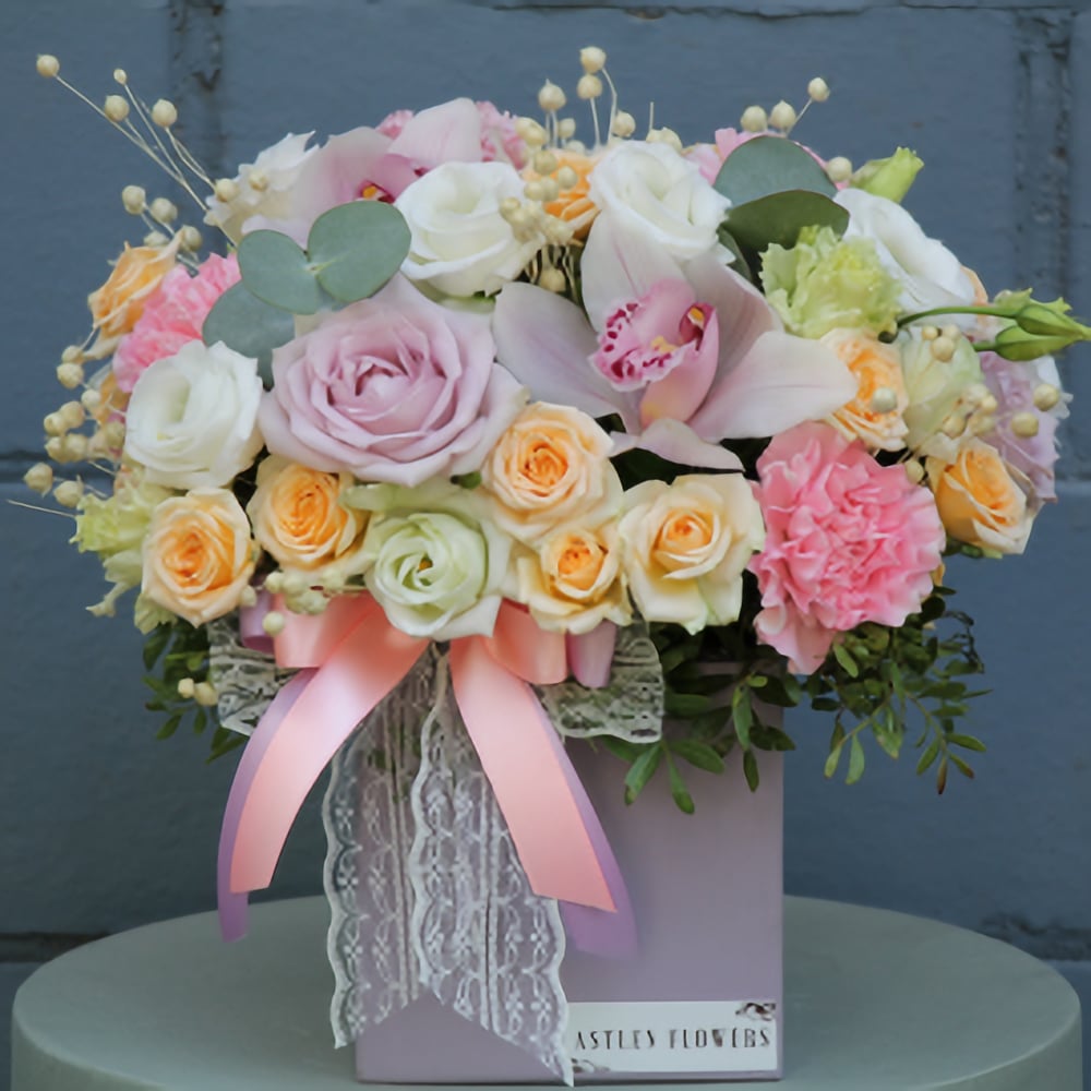 Нежная гамма композиции подойдет для подарка близким и коллегам