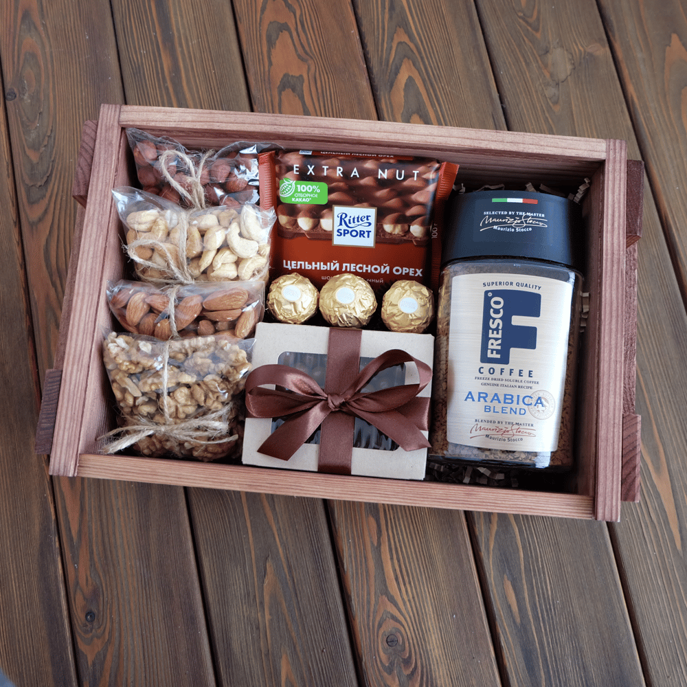 В наборе: 📌Ящик военный деревянный 30*21*9 см 📌Кофе растворимый 📌Фундук, кешью, миндаль, грецкий орех 📌Шоколад Ritter Sport 📌Арахис в шоколаде 📌FERRERO ROCHER