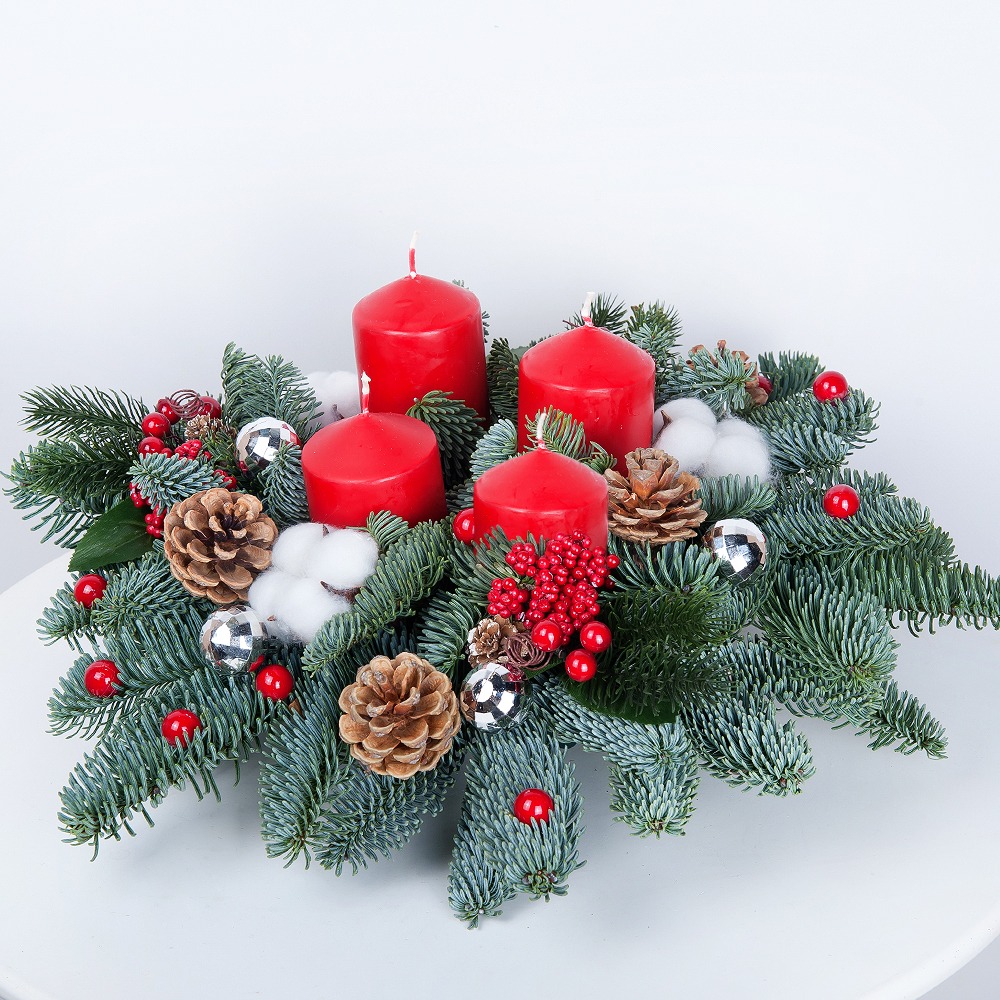 Эта потрясающая зимняя композиция создает атмосферу уюта и праздника. Ель нобилис, украшенная новогодним декором и свечами, подарит Вам ощущение тепла и волшебства в холодные зимние дни.