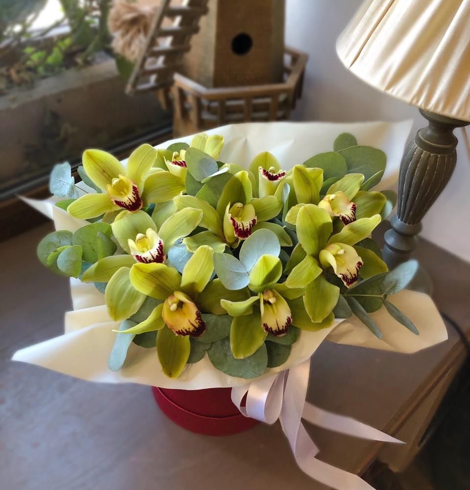 Шляпная коробка с цветами «Восхищение» из орхидей