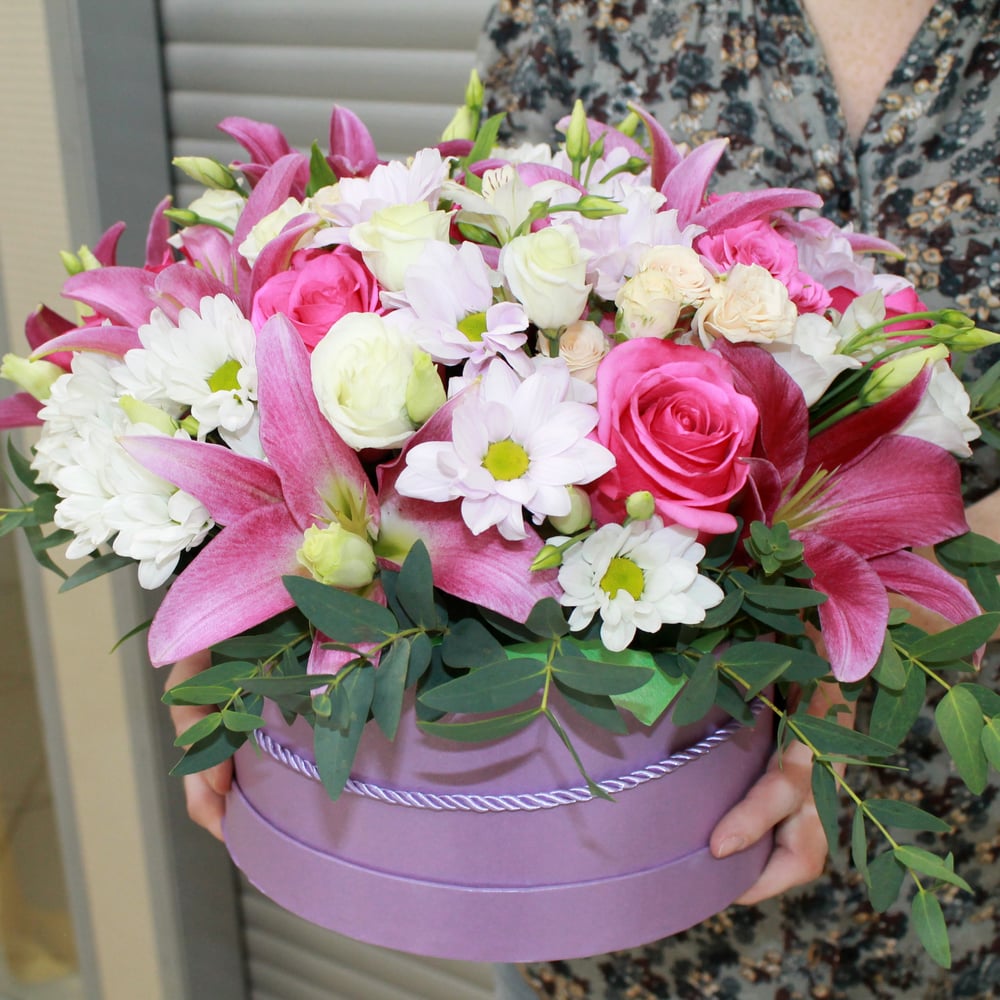 Шляпная коробка с цветами «Восторг» из роз и хризантем