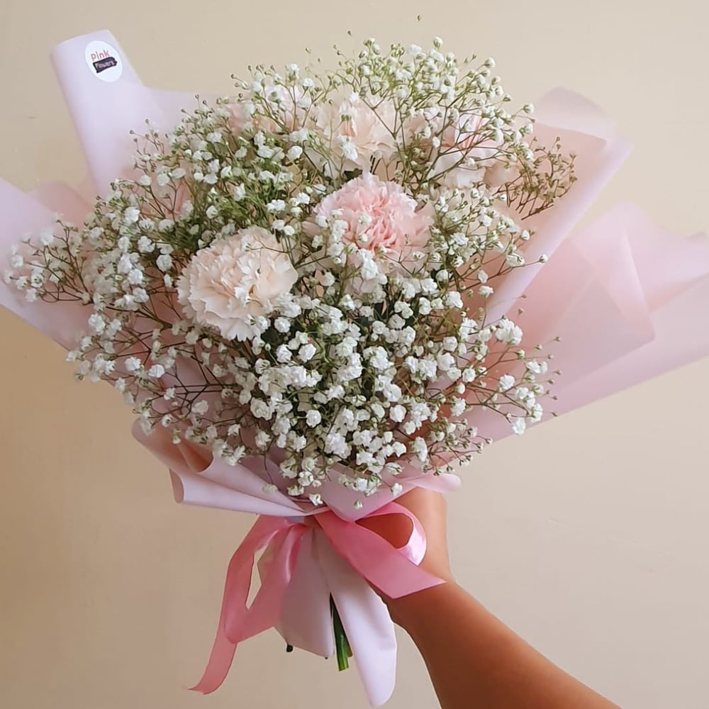 Букет из гвоздик и гипсофилы - это легкая, воздушная композиция, которая порадует своим нежным и романтичным видом. Гвоздики, известные своей прекрасной формой, придают букету элегантности. Гипсофила, известная также как "облачная трава", добавляет воздушности и легкости, создавая эффект нежных облачков в букете. Этот букет станет прекрасным подарком для любого повода и порадует своей изысканностью и изяществом.