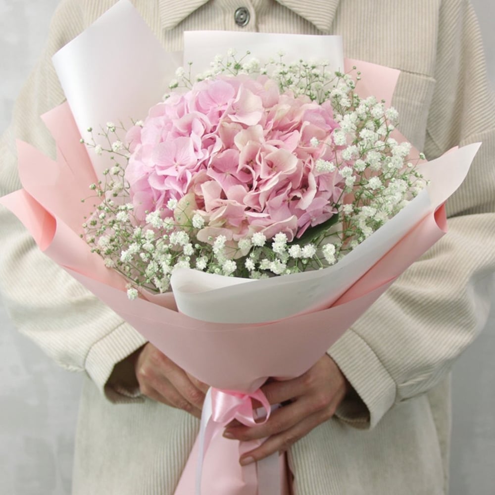 Нежный букет, основой композиции которого является элегантная гортензия, окружённая соцветиями воздушной гипсофилы.
