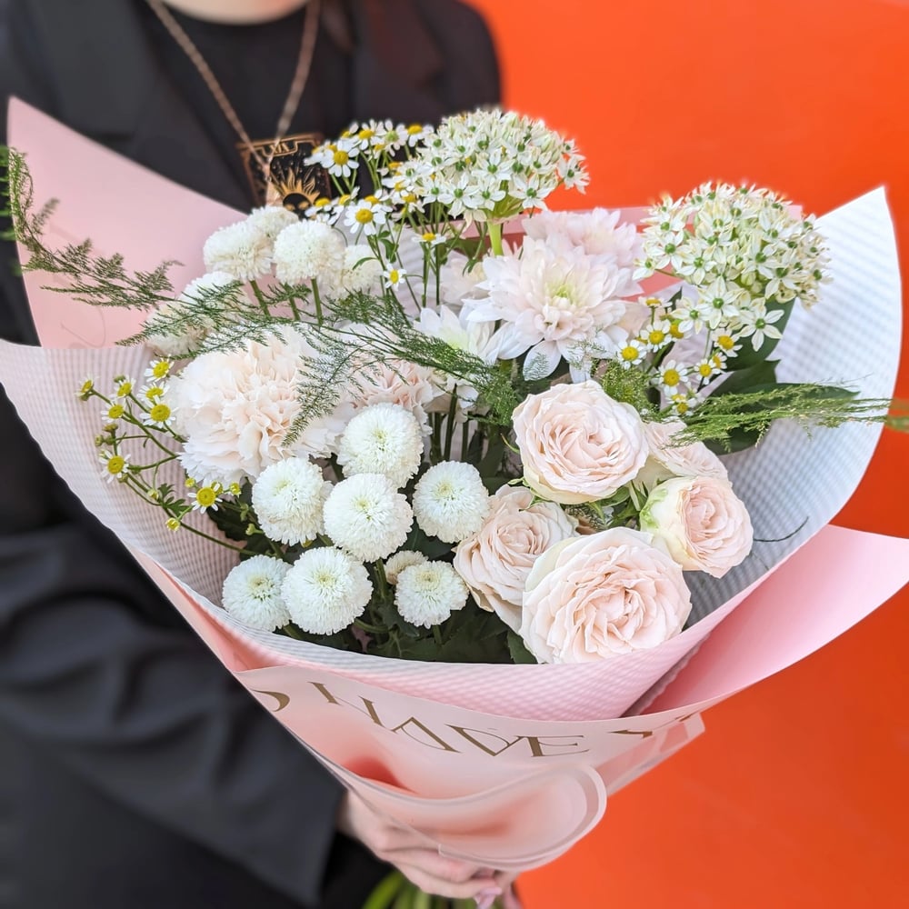 Букет «Воздушный поцелуй» из хризантем и ромашек